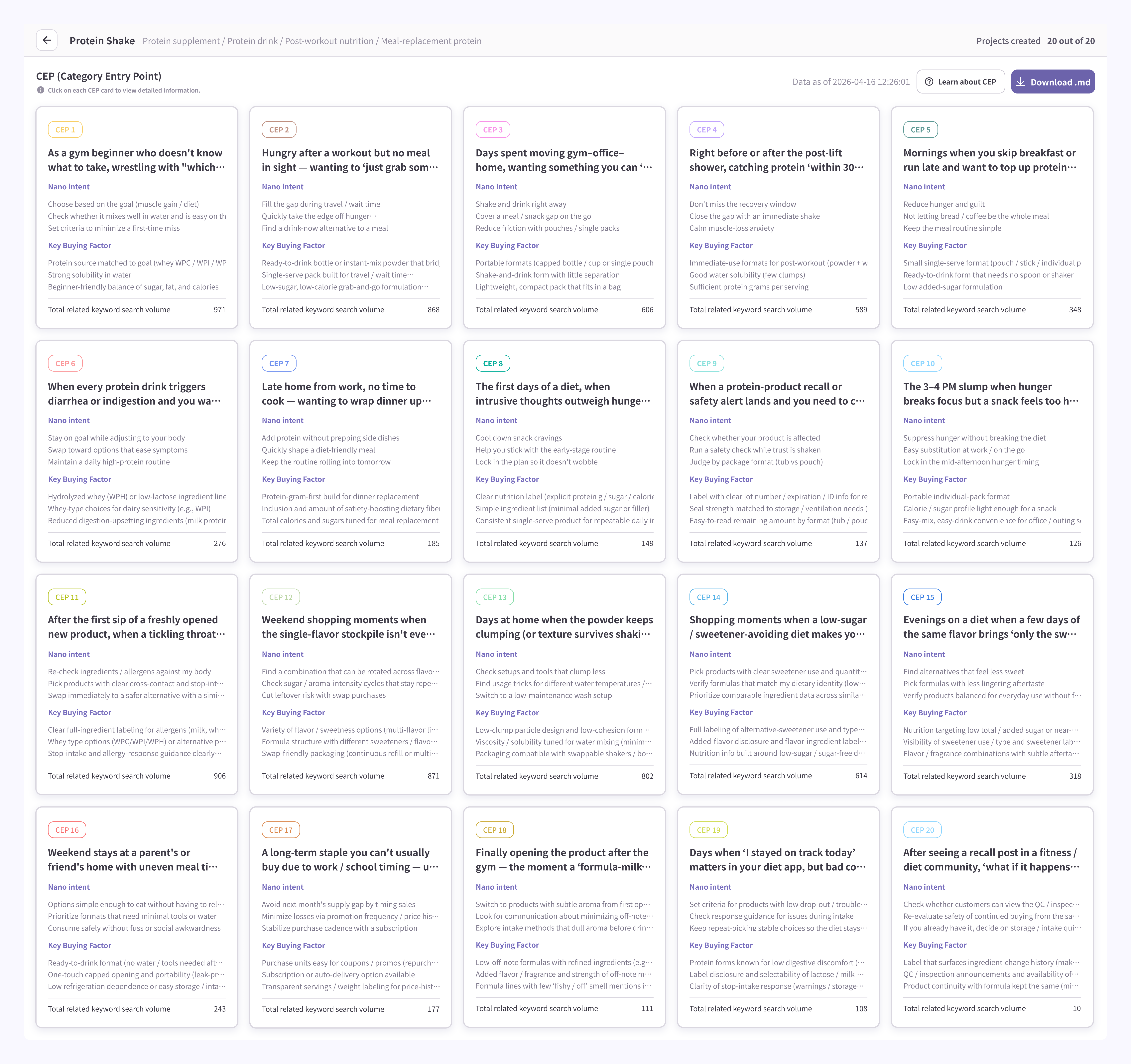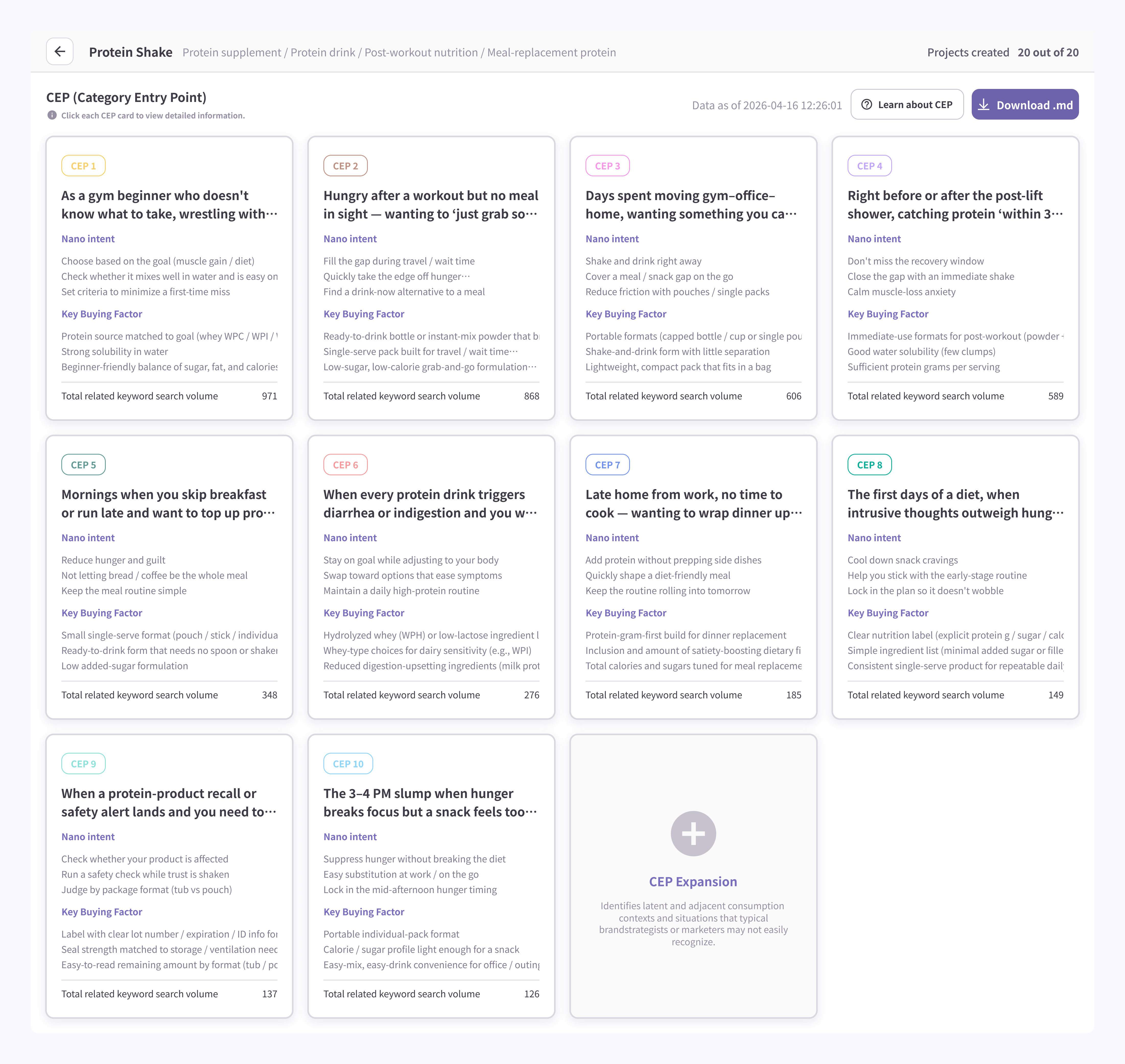 The results screen is organized around the CEP card grid so users can focus directly on the core insights. Each card represents a single CEP scenario and surfaces its Nano intent, Key Buying Factor, and the total search volume of related keywords at a glance. The top of the screen also shows the product being analyzed alongside the data collection date, so you always know which moment in time the insights are drawn from.