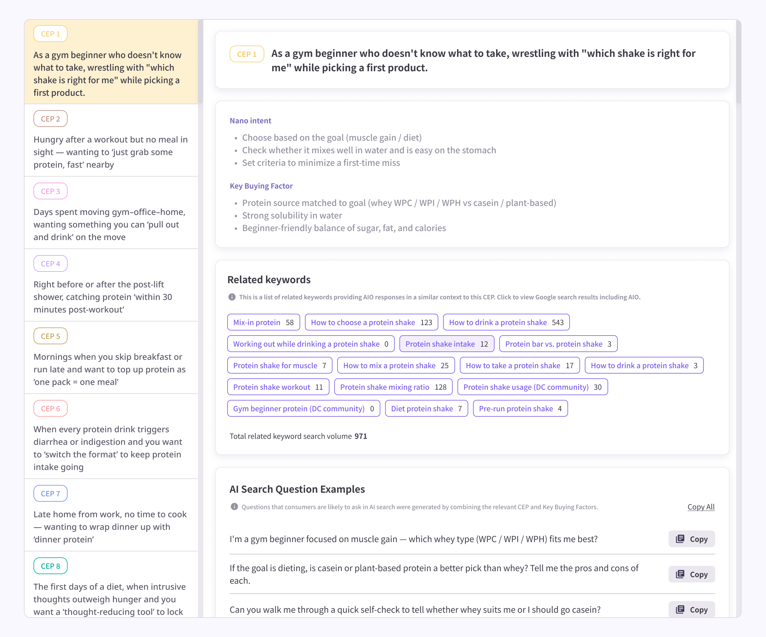 The AI search question examples combine the CEP and its Key Buying Factors to automatically generate questions consumers are likely to type into an AI search bar — ready to be applied directly to content and search strategy.