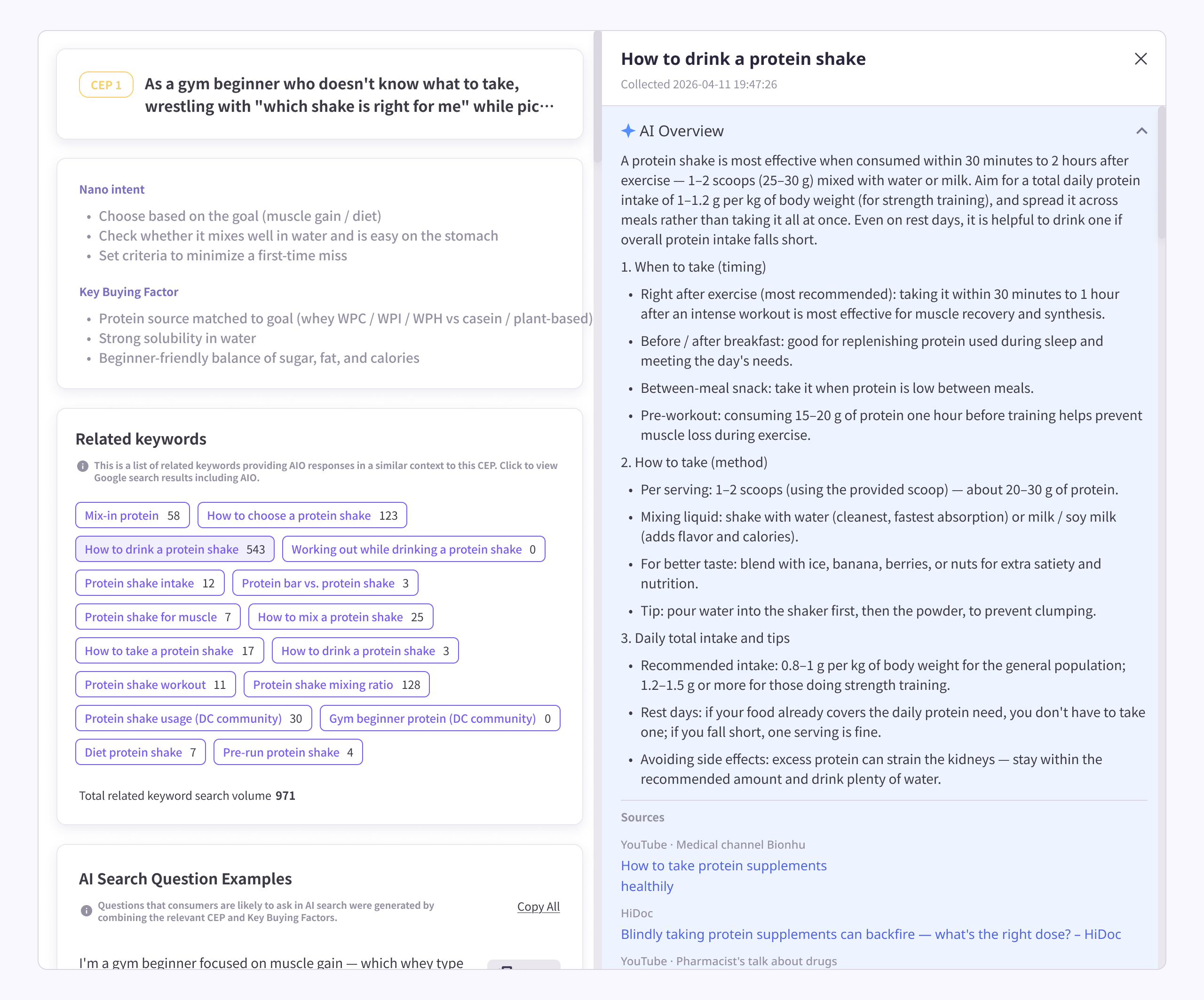 The CEP Finder goes beyond simply listing "what users are searching for." Instead, it uses AI to deeply investigate and analyze "at what moments and why your customers think of and consider a specific product category." Just enter a product name, and it compiles everything into a single report — from real-world pain points consumers face, to frequently searched keywords, and even specific question examples they might type into an AI search engine. It is an extremely useful tool.