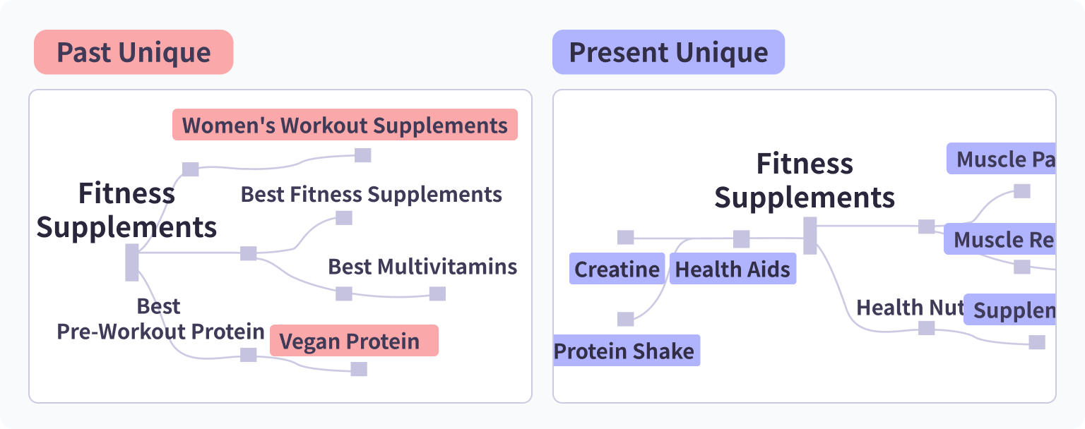 Consumer intent changes over time, and these shifts can be seen through changes in search paths. The Past/Present Comparison feature is especially useful for checking the effectiveness of a marketing campaign or determining whether a newly launched product is becoming recognized by consumers.