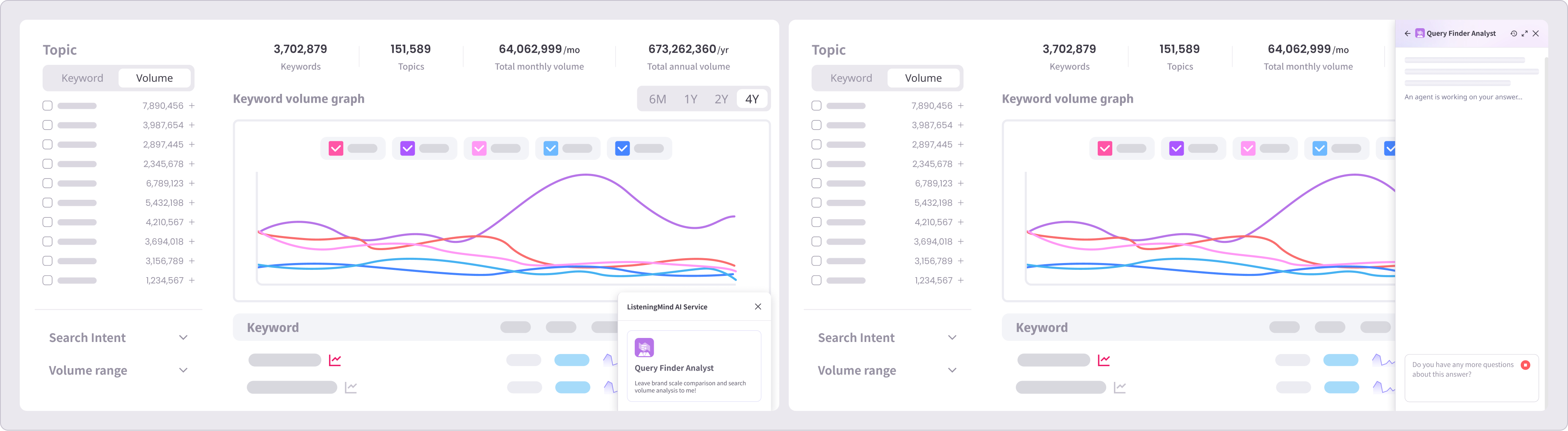 The ListeningMind AI Agent uses generative LLMs to help interpret and support analysis based on search result data. You can quickly run data analysis tasks through pre-built agents and communicate with them directly.