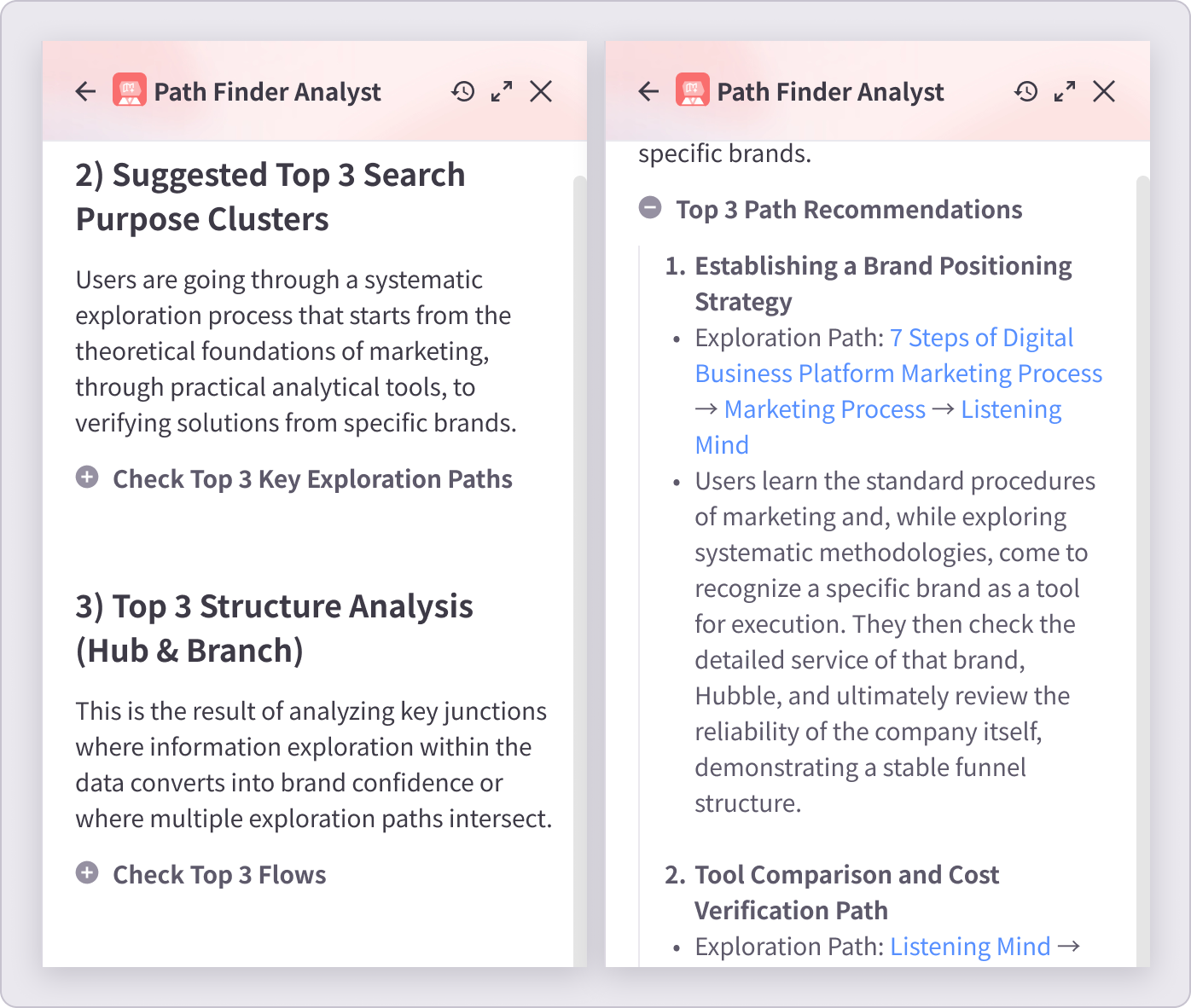 Pattern Changes Points out intuitive shifts, such as how [Path A] in the past has evolved or expanded into [Path B]. | Path Comparison Analysis Derives critical disposition differences and insights between the two groups. | Search Purpose Trends Explains the psychological shifts behind consumer interest changes (e.g., Interest A → Interest B). |