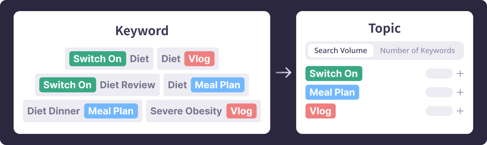 When you enter your seed keywords, Intent Finder automatically extracts related keywords and groups them into “topics” based on how they appear in real-world search data. Powered by over 1.7 billion Google search data points, the system identifies which topics consumers are actually interested in for each keyword.