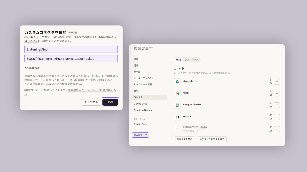 Claudeが提供するカスタムコネクタを利用して、リスニングマインドのデータをClaudeに接続する方法をご紹介します。
