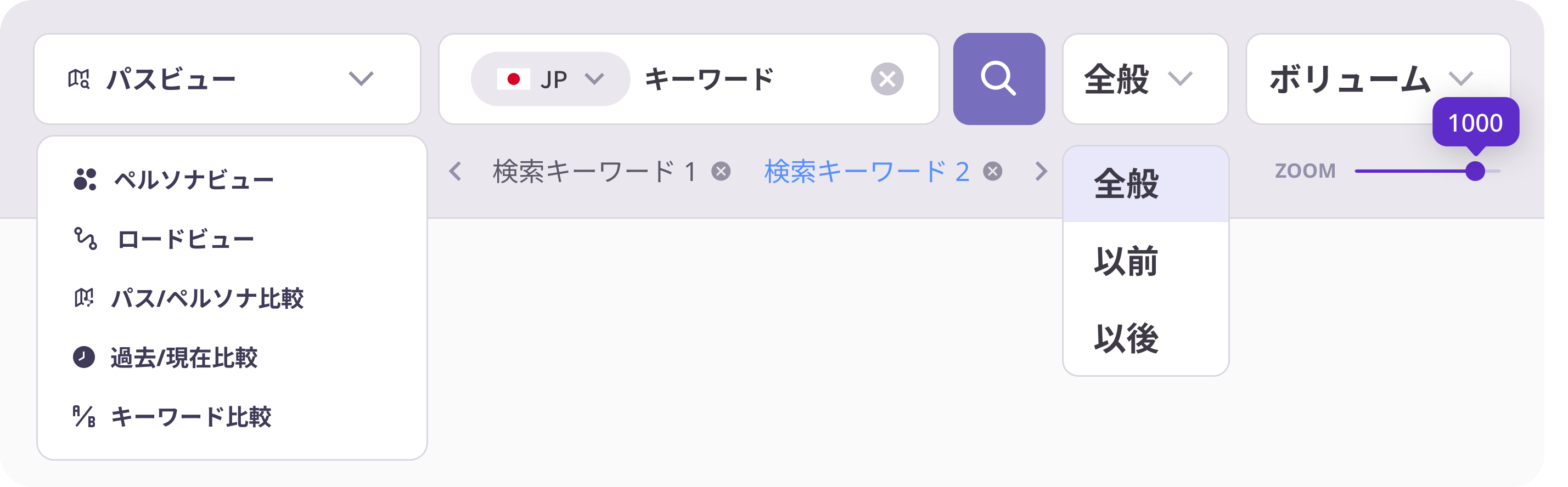 こうした検索経路に内在する多様な意図を可視化するためのビューが、ペルソナビューです。パス/ペルソナ比較モードでは、検索経路(パス)と検索意図のグループ(ペルソナ)を、1つの画面で並べて確認できます。