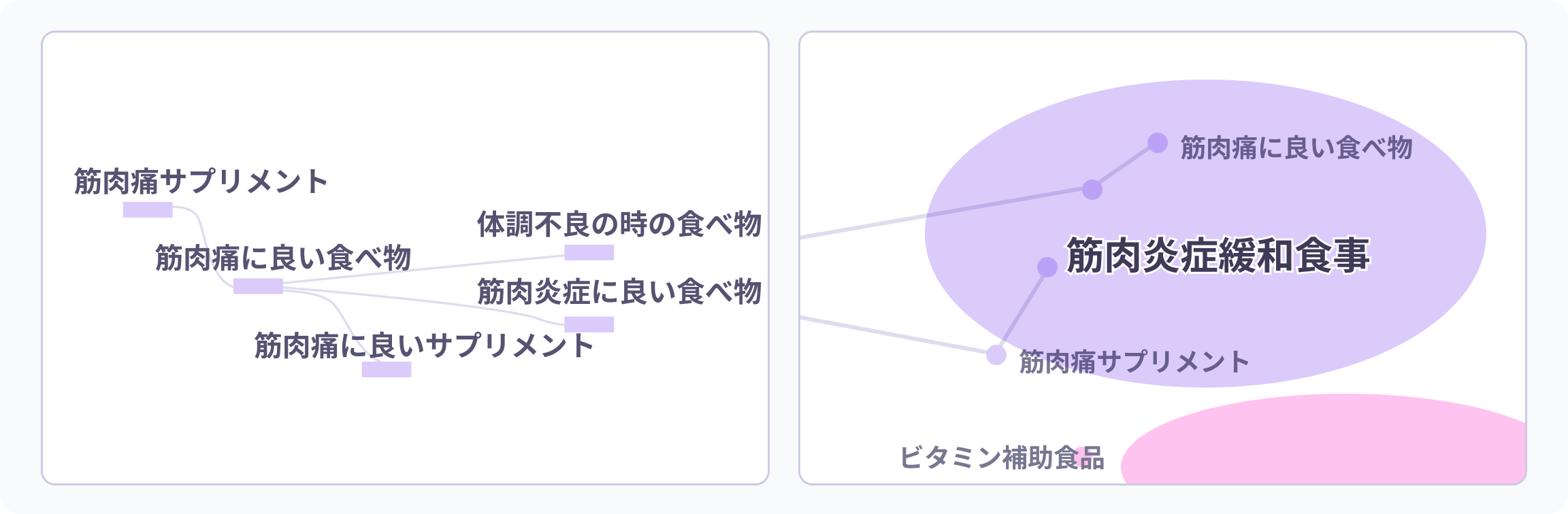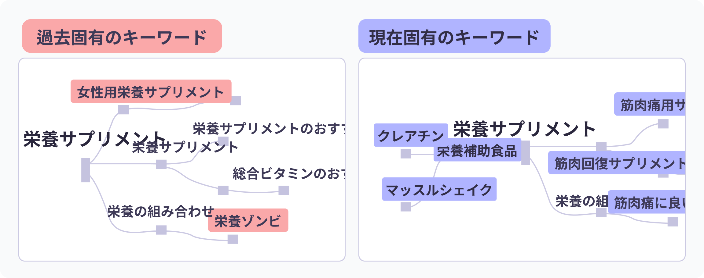 2つのキーワードの検索経路を1画面で並べて表示することで、検索フローや検索意図の違いを直感的に確認できます。
