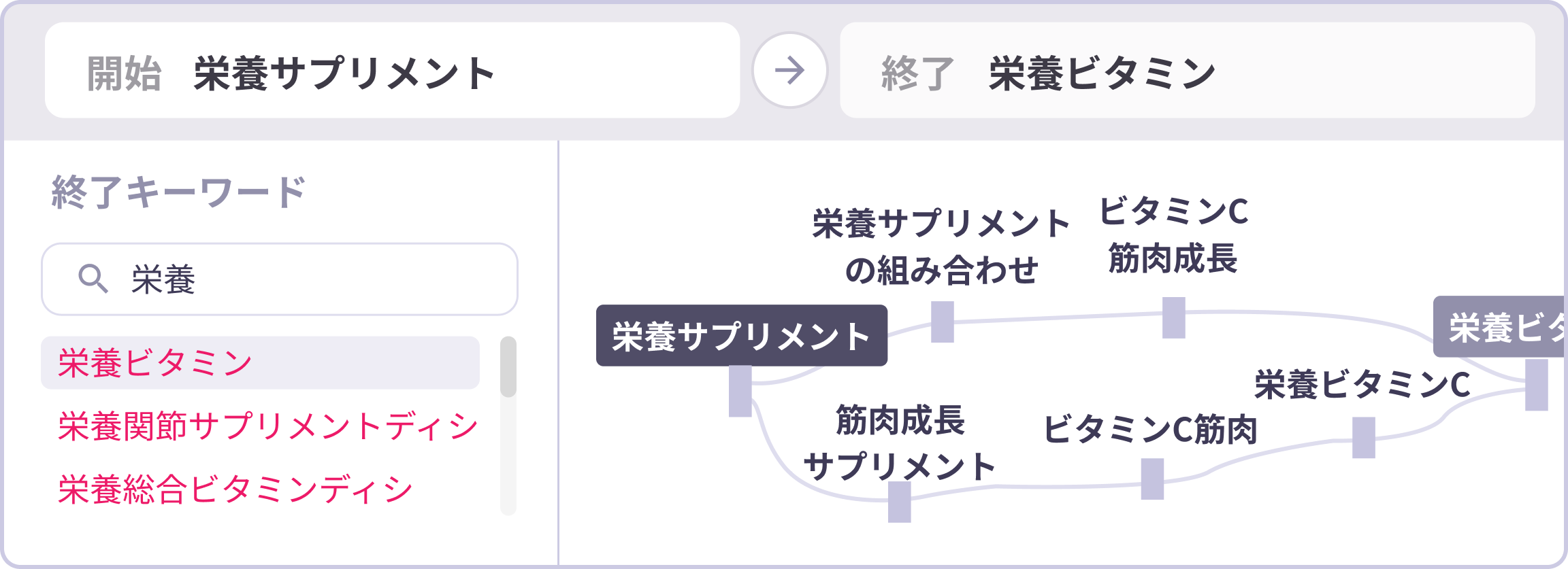 キーワード入力欄に、調べたいキーワード(例:フィットネス サプリ)を入力すると、つながりのあるキーワードが終点候補として表示されます。その中から、確認したいキーワードを選択し、検索経路を確認します。