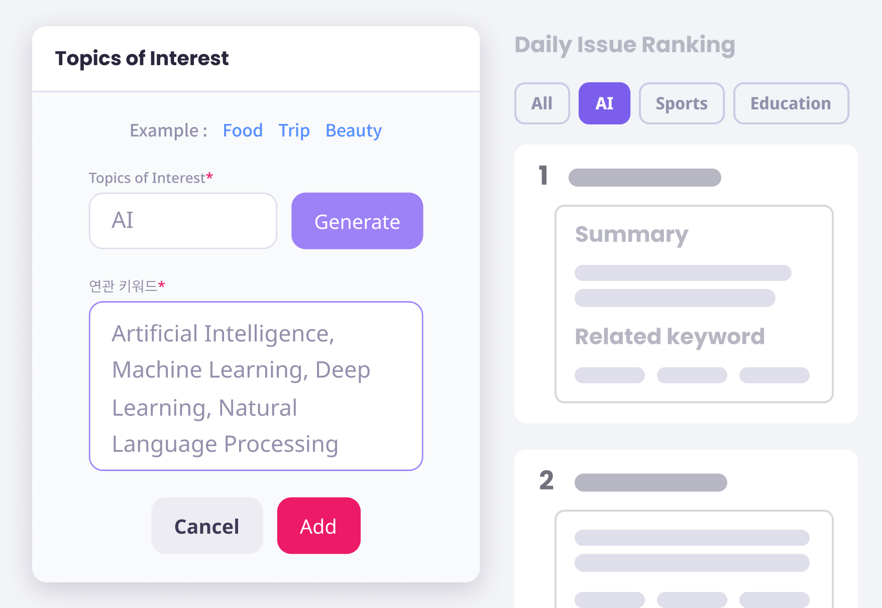 追加された関心テーマに類似する話題のキーワードを確認できます。*より広い観点で探索できるよう、テーマとの類似性が高い結果を提供するため、意図と異なる結果が出る場合があります。