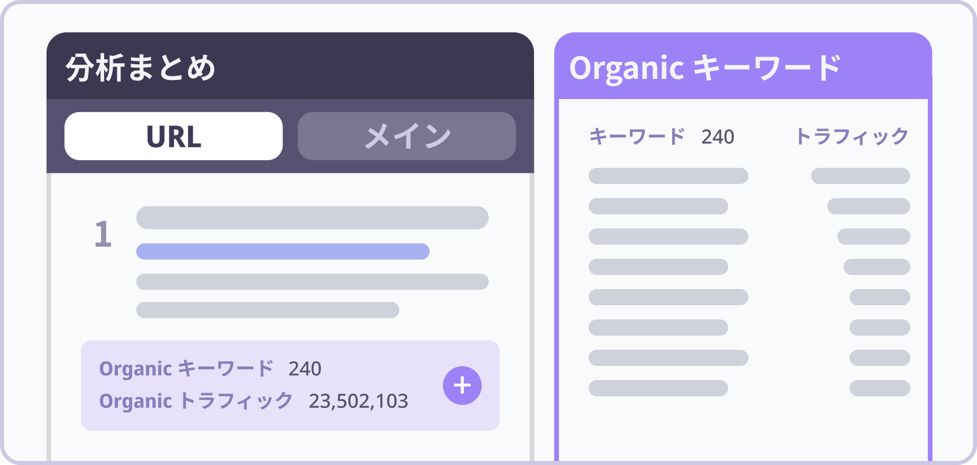 各URL/ドメインの右側にある 「+」アイコンをクリックすると、どの検索キーワードで上位表示されているかを確認できます。