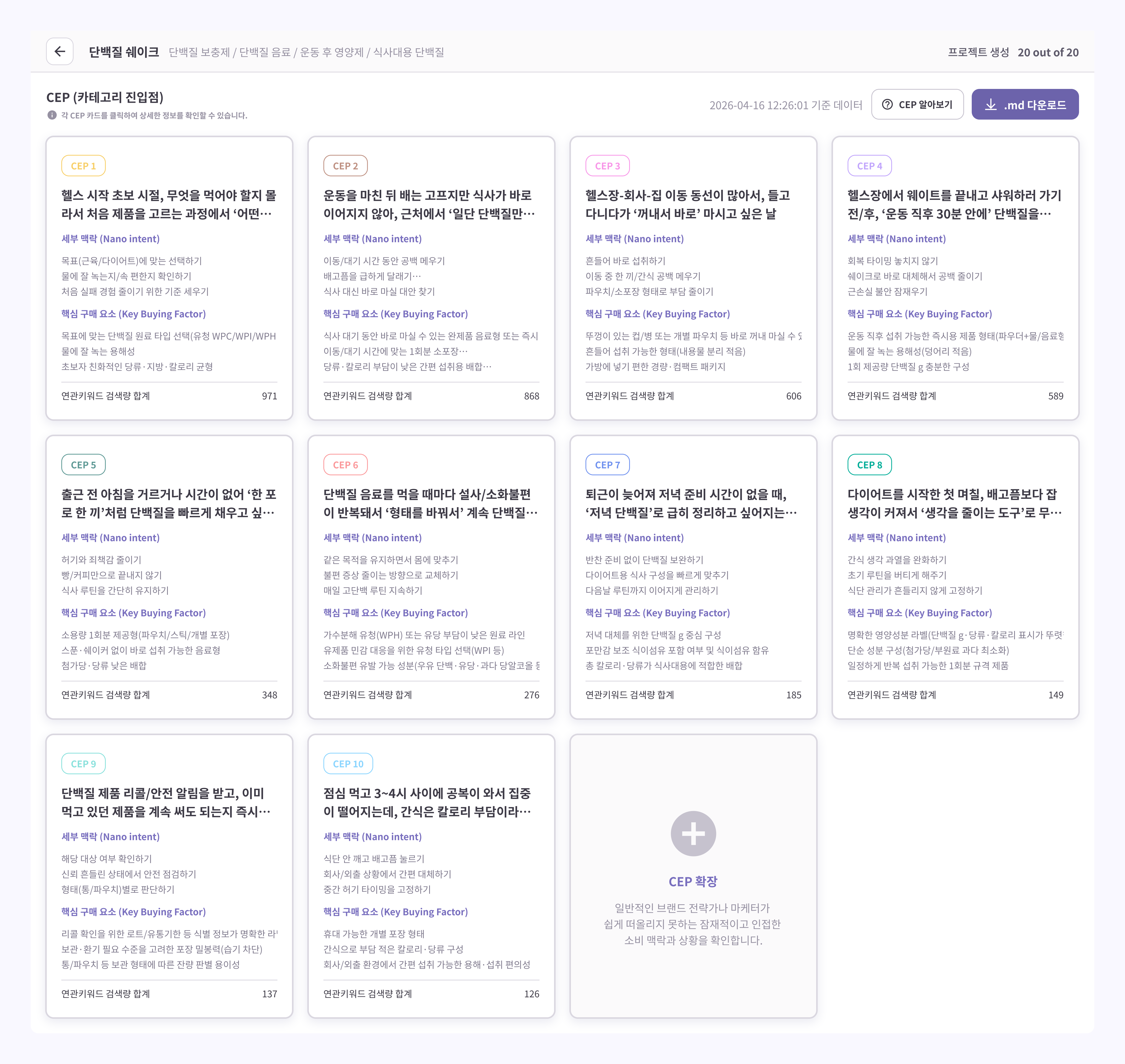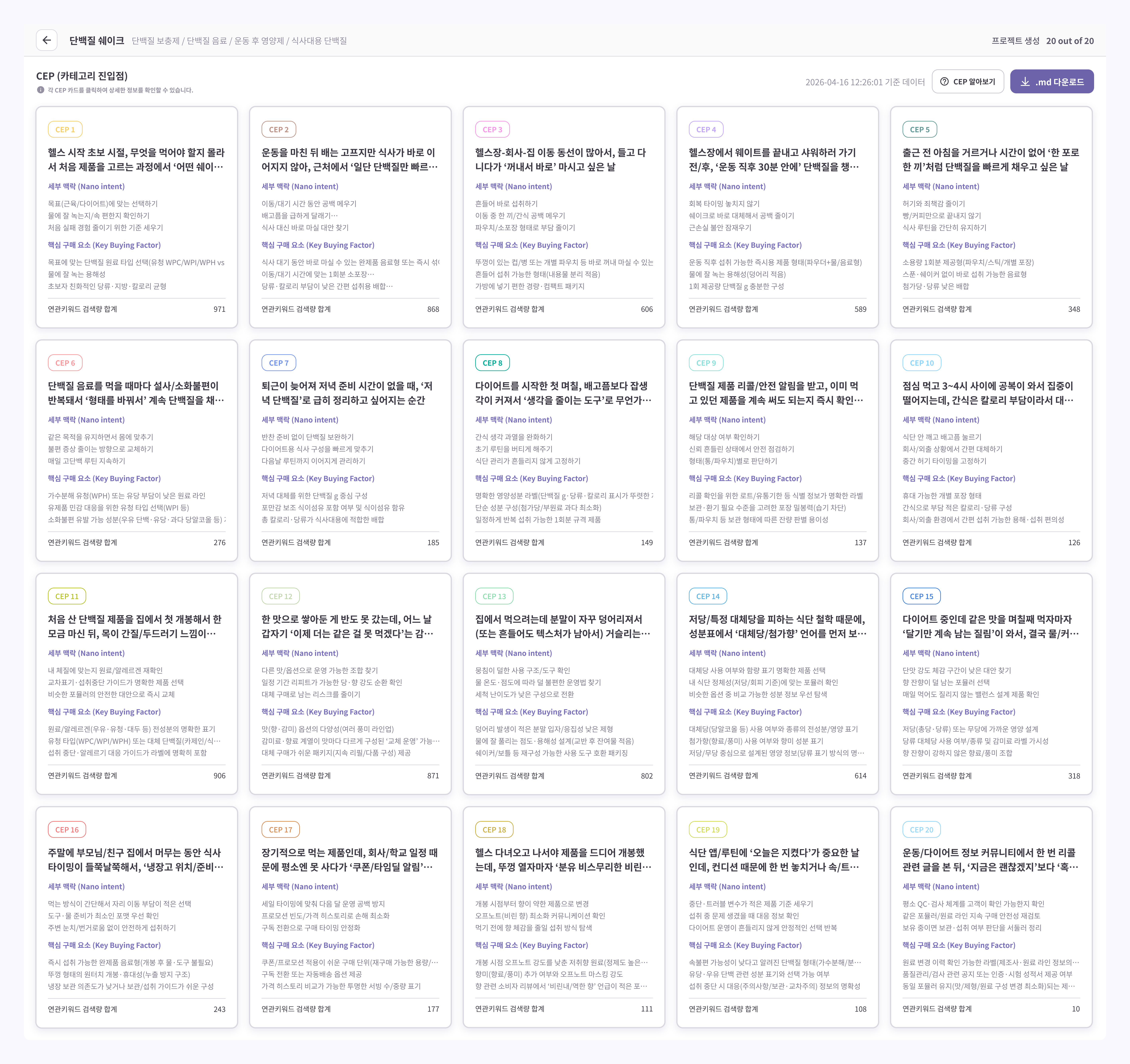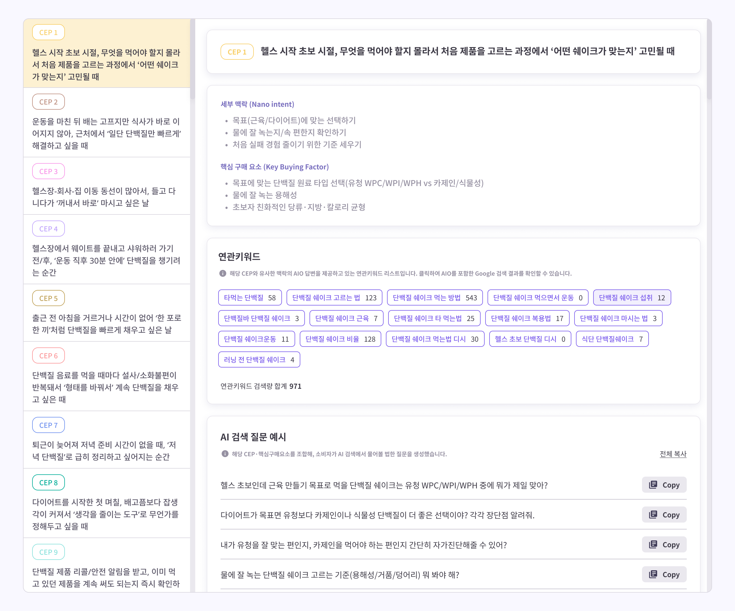 결과 화면은 CEP 카드 그리드를 중심으로 구성되어, 사용자가 곧바로 핵심 인사이트에 집중할 수 있습니다. 각 카드는 하나의 CEP 상황을 대표하며, 그 상황에 해당하는 세부 맥락(Nano intent), 핵심 구매 요소(Key Buying Factor), 연관키워드 검색량을 한눈에 보여줍니다. 화면 상단에는 분석 대상 제품과 데이터 수집 기준일이 함께 표기되어, 지금 보고 있는 인사이트가 어느 시점의 데이터에서 도출된 것인지 확인할 수 있습니다.