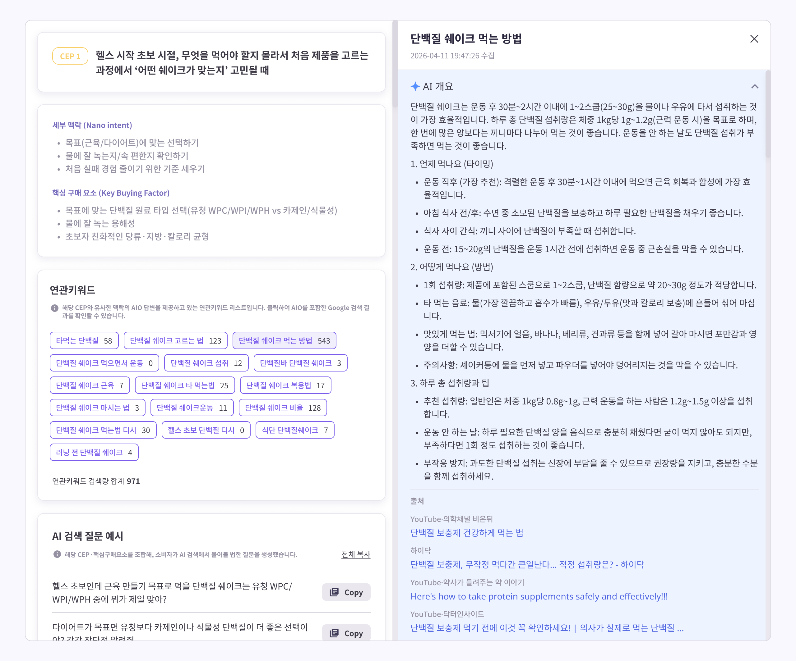 특정 CEP 카드를 클릭하면 해당 상황의 인사이트를 심층적으로 살펴볼 수 있는 모달이 열립니다. 모달은 크게 세부 맥락·핵심 구매 요소 요약, AI 검색 질문 예시, 연관키워드 검색 결과(SERP) 세 가지 정보로 구성되어 있습니다.