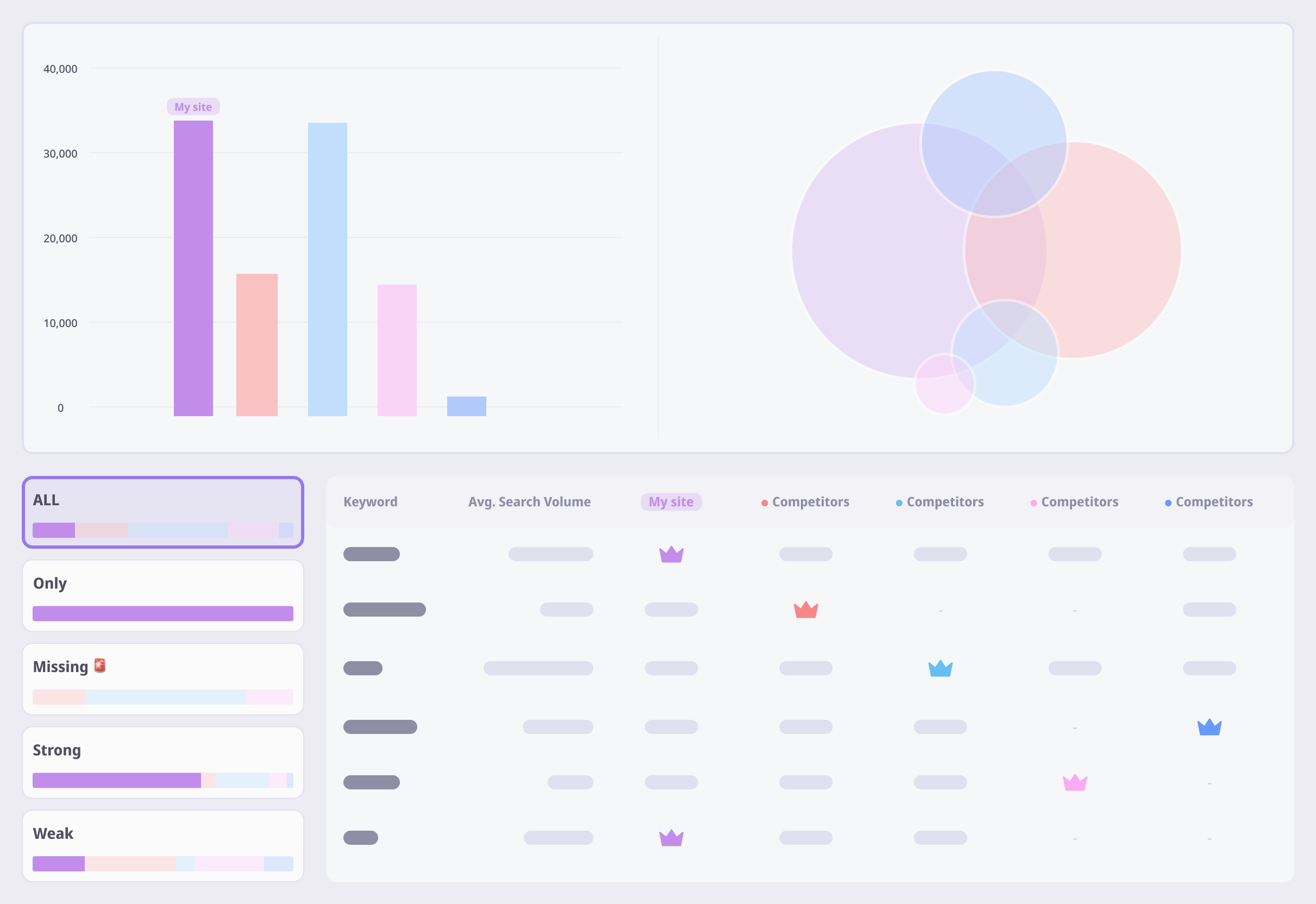 키워드갭은 자사와 경쟁사의 Organic 키워드 및 잠재 트래픽을 비교할 수 있는 기능입니다.