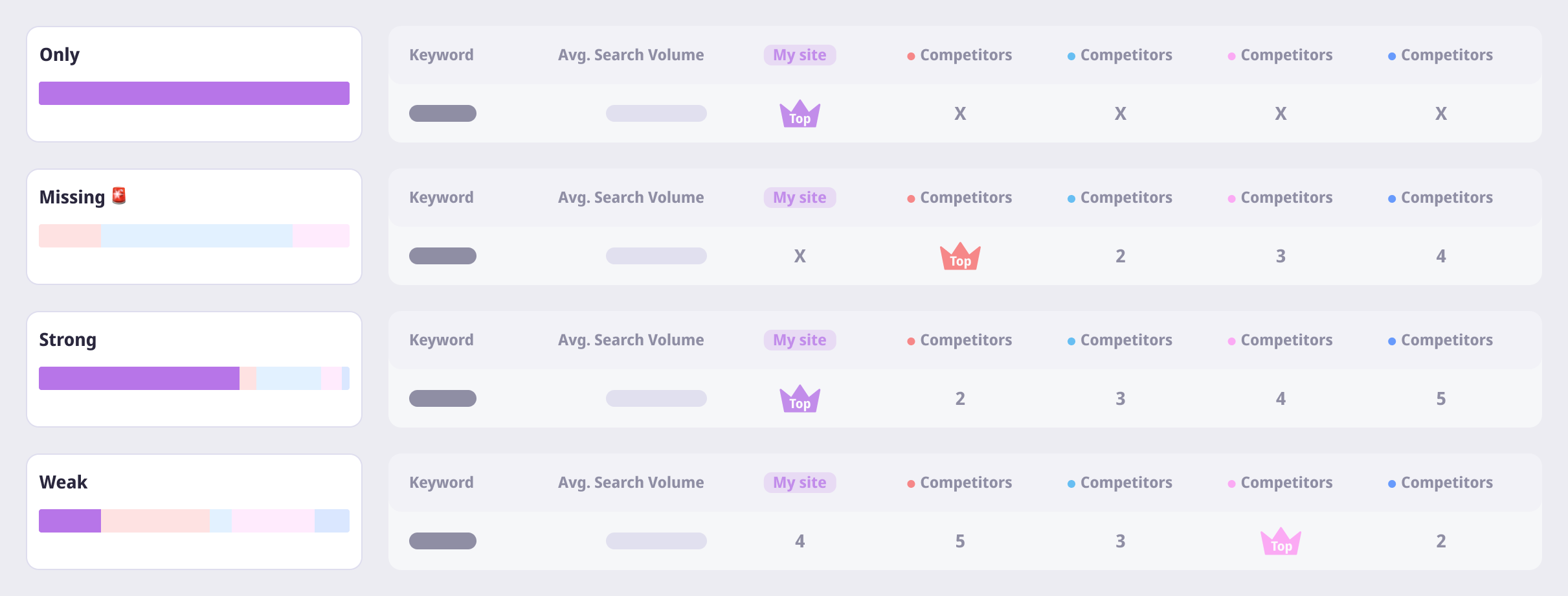 우리가 약세를 보이는 개선 대상 키워드로, 콘텐츠 리프레시 및 보강을 꾀할 수 있습니다.