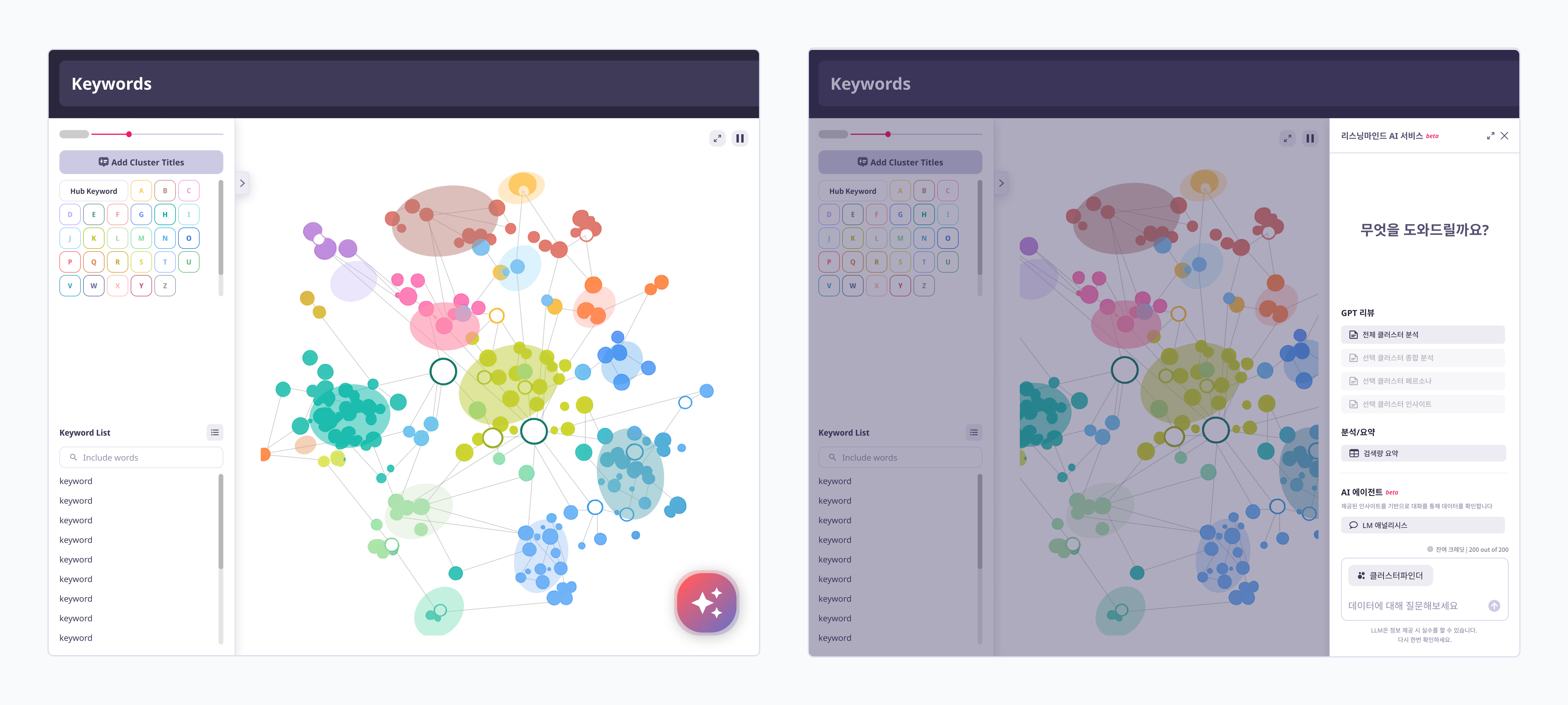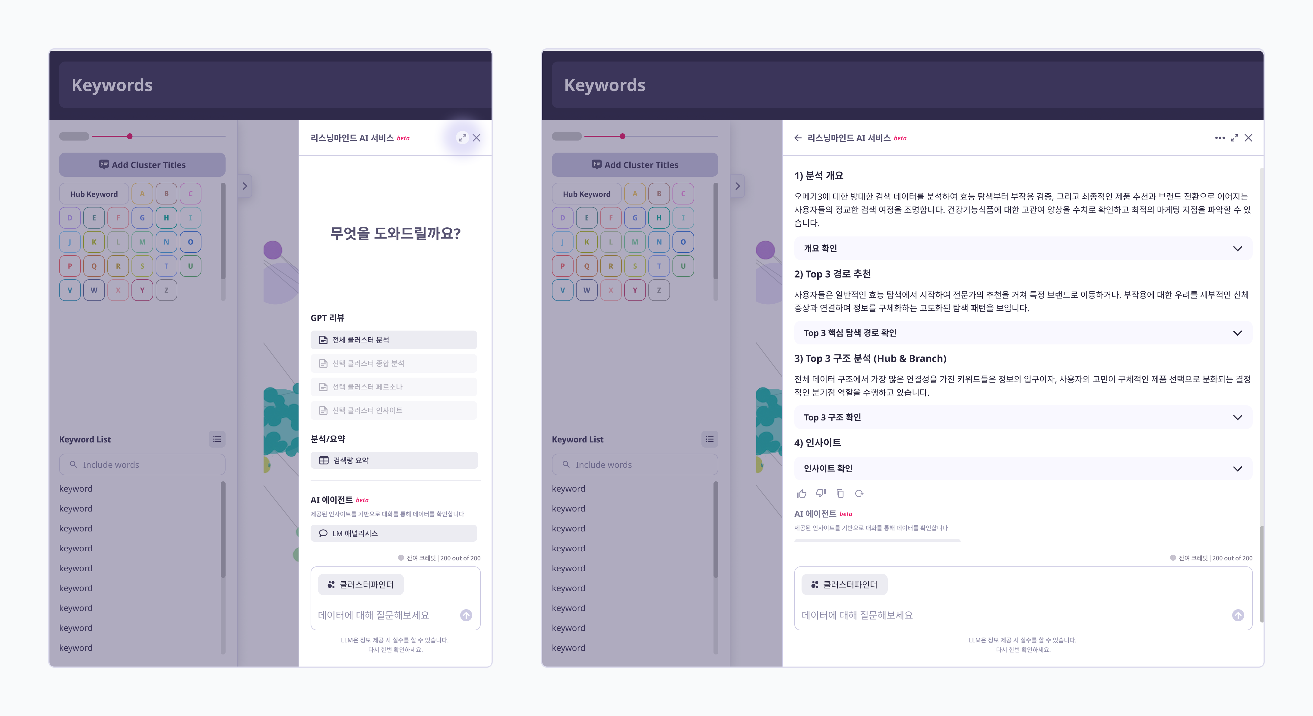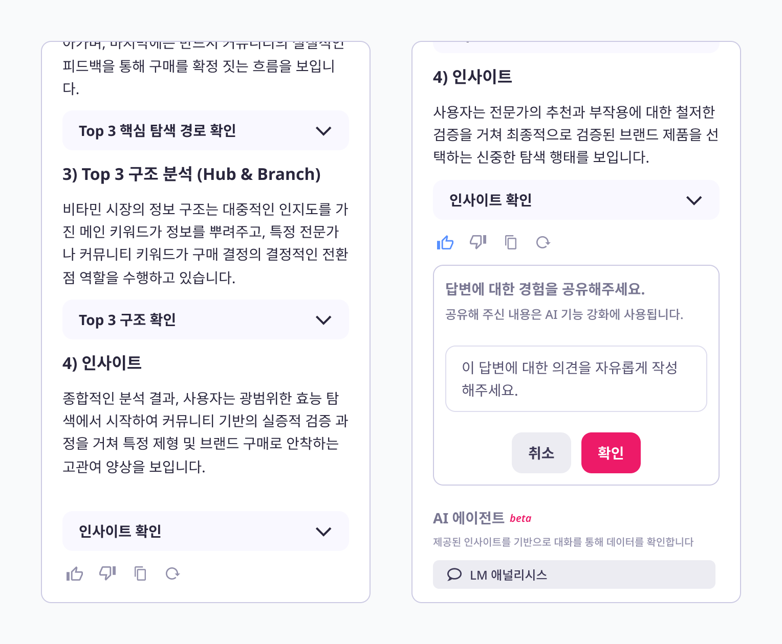 리스닝마인드 AI 에이전트는 생성형 LLM을 통해 조회 결과의 데이터 기반 해석 및 보조를 제공합니다. 생성되어 있는 Agent를 통한 빠른 데이터 분석 작업 실행 및 직접 커뮤니케이션이 가능합니다.