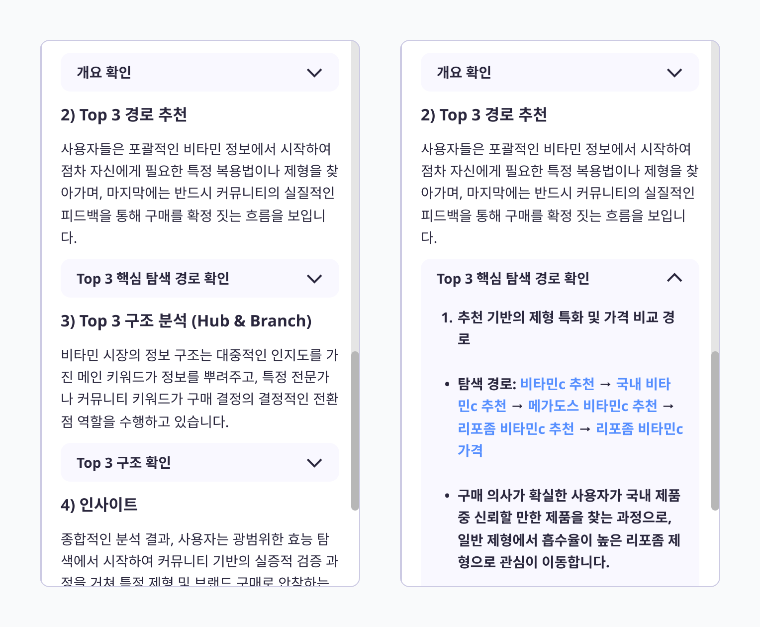 Top 5 검색 목적 키워드 데이터를 분석하여 사용자의 핵심적인 검색 의도(Intent) 상위 5가지를 그룹핑하여 제안합니다. | Top 3 경로 추천 제공된 데이터를 기반으로 그래프를 구축하고, 사용자의 핵심적인 검색 경로 상위 3가지를 탐색하여 제안합니다. | Top 3 검색 목적 추천 허브 키워드(Hub Keyword)를 중심으로 유사한 의도를 가진 클러스터들을 그룹핑하여, 사용자의 주요 검색 목적 상위 3가지를 제안합니다. |