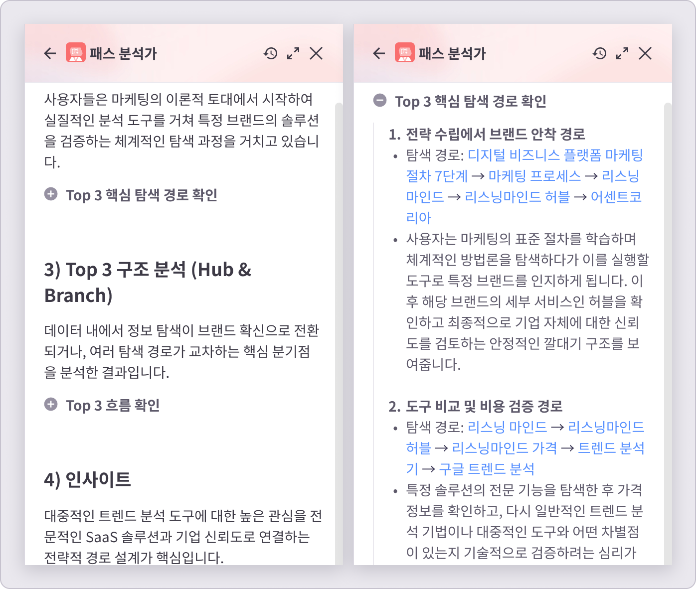 과거 대비 현재의 패턴 변화 과거의 [경로 A]가 현재는 [경로 B]로 변화/확장되었다는 식의 직관적인 변화 양상을 짚어줍니다. | 경로 비교 분석 두 그룹 간의 결정적 성향 차이와 인사이트를 도출합니다. | 검색 목적 변화 흐름 [과거] 관심사 A 중심 → [현재] 관심사 B 중심의 형태로, 변화의 양상과 그 배경에 숨겨진 소비자들의 심리적 변화를 추론하여 설명해 줍니다. |