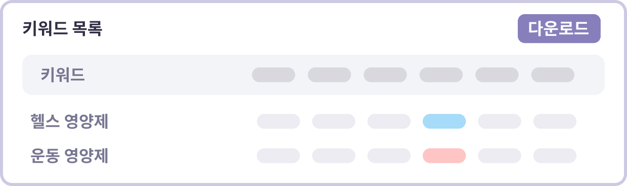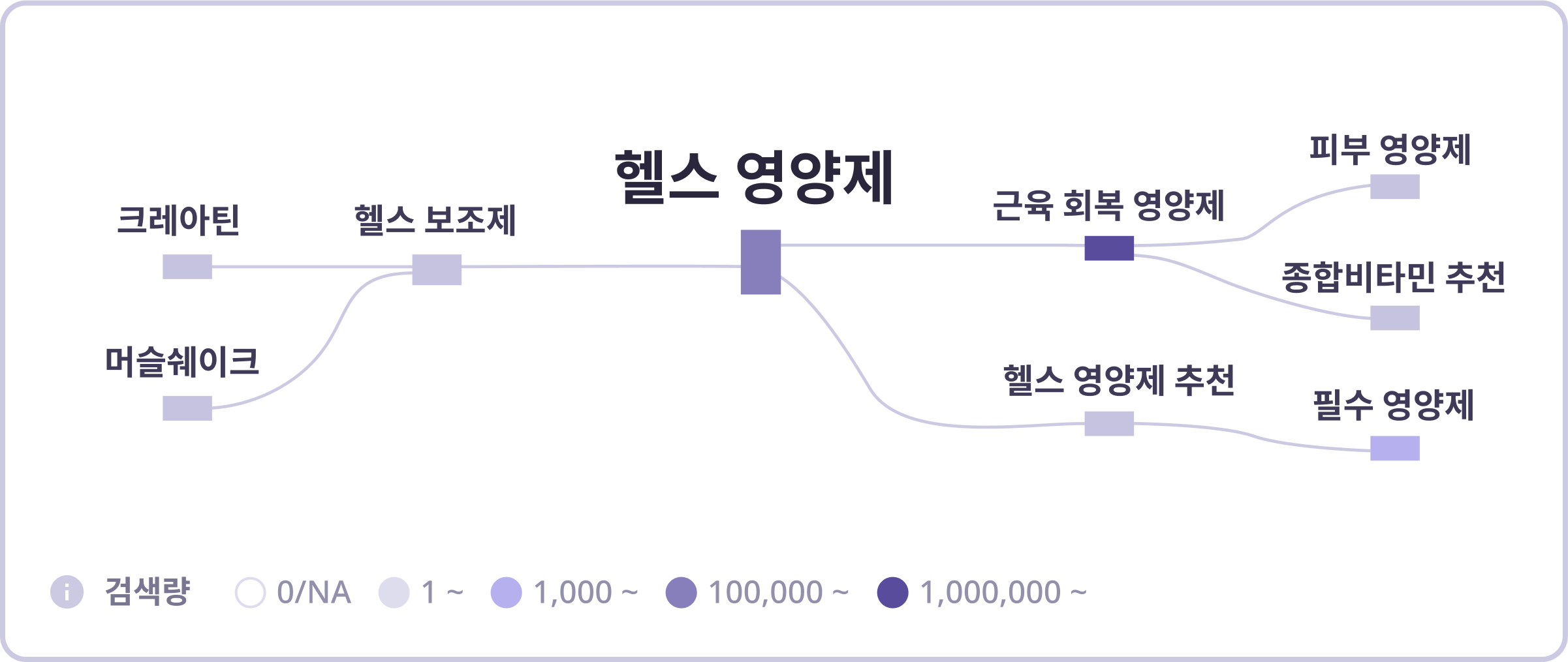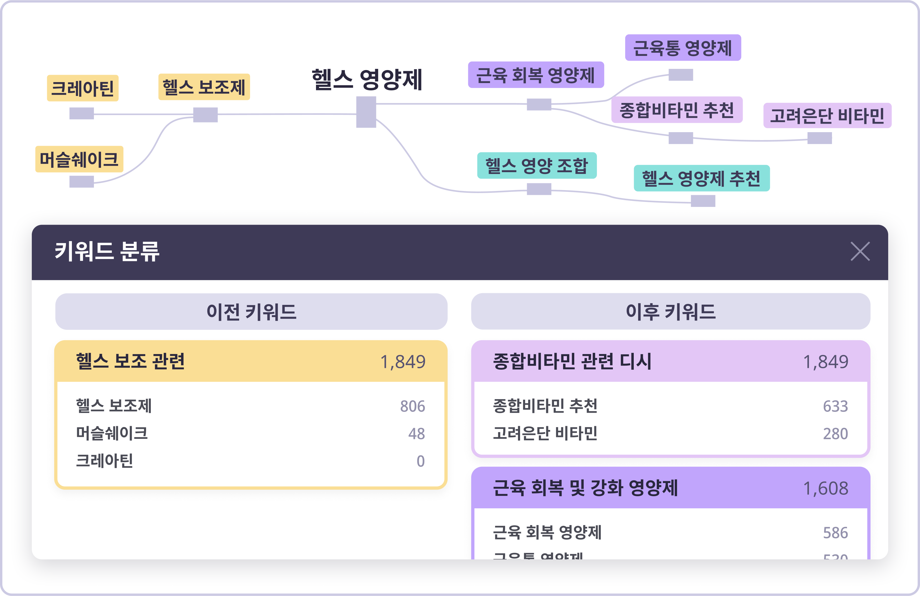키워드 분류 기능을 통해 ‘검색 키워드’을 이전 키워드와, 그 이후에 검색한 이후 키워드를 나눠서 볼 수 있습니다. 그뿐만 아니라, ‘헬스보조제’, ‘머슬쉐이크’ 등 비슷한 의미를 지닌 키워드들이 자동으로 그룹핑 되어 나타나기 때문에 검색 경로를 보다 직관적으로 이해할 수 있습니다.