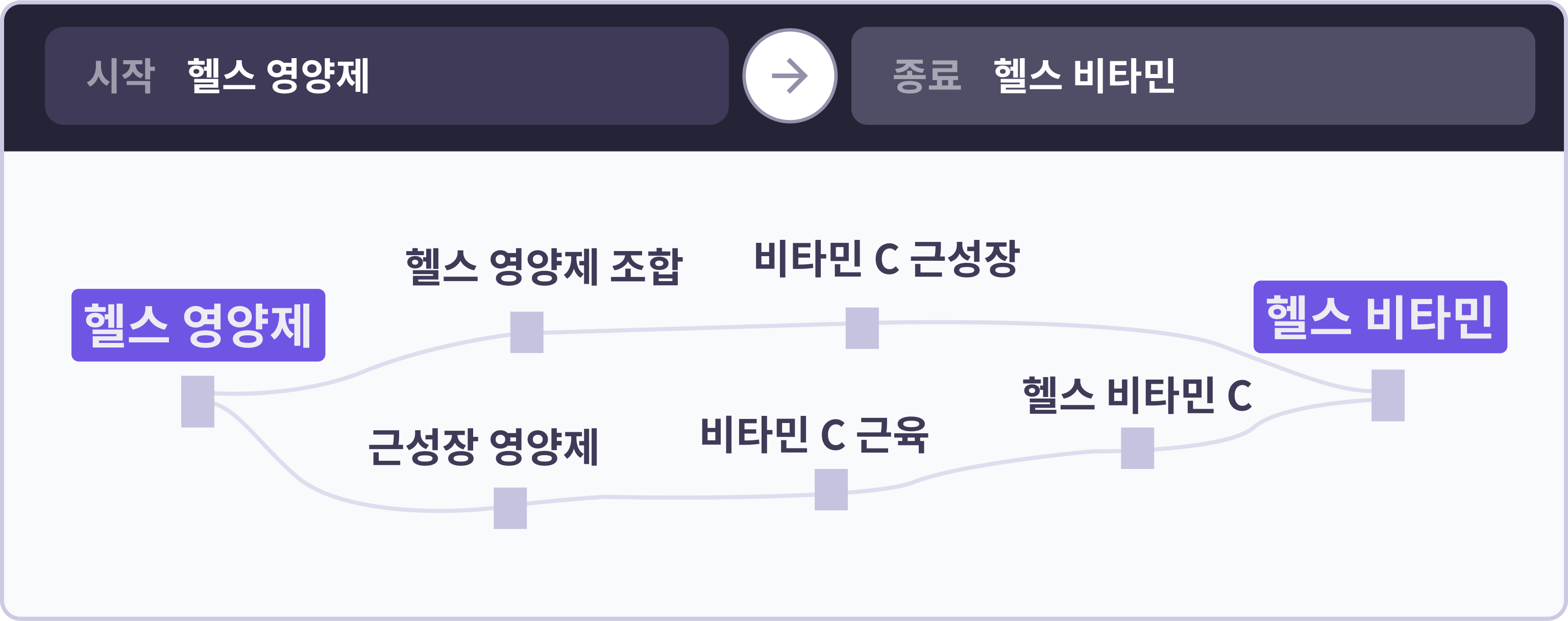 키워드 입력 란에 궁금한 키워드(헬스 영양제)를 넣으면, 연결되어 있는 키워드들이 종료 지점에 나타납니다. 원하는 키워드를 선택해 경로를 확인할 수 있습니다.
