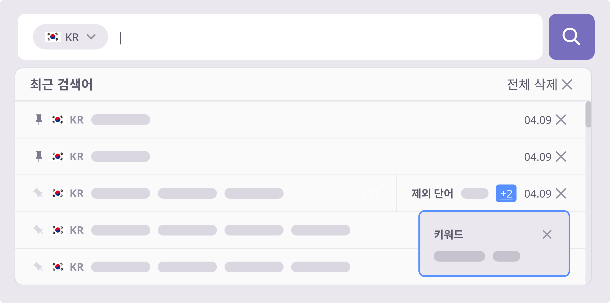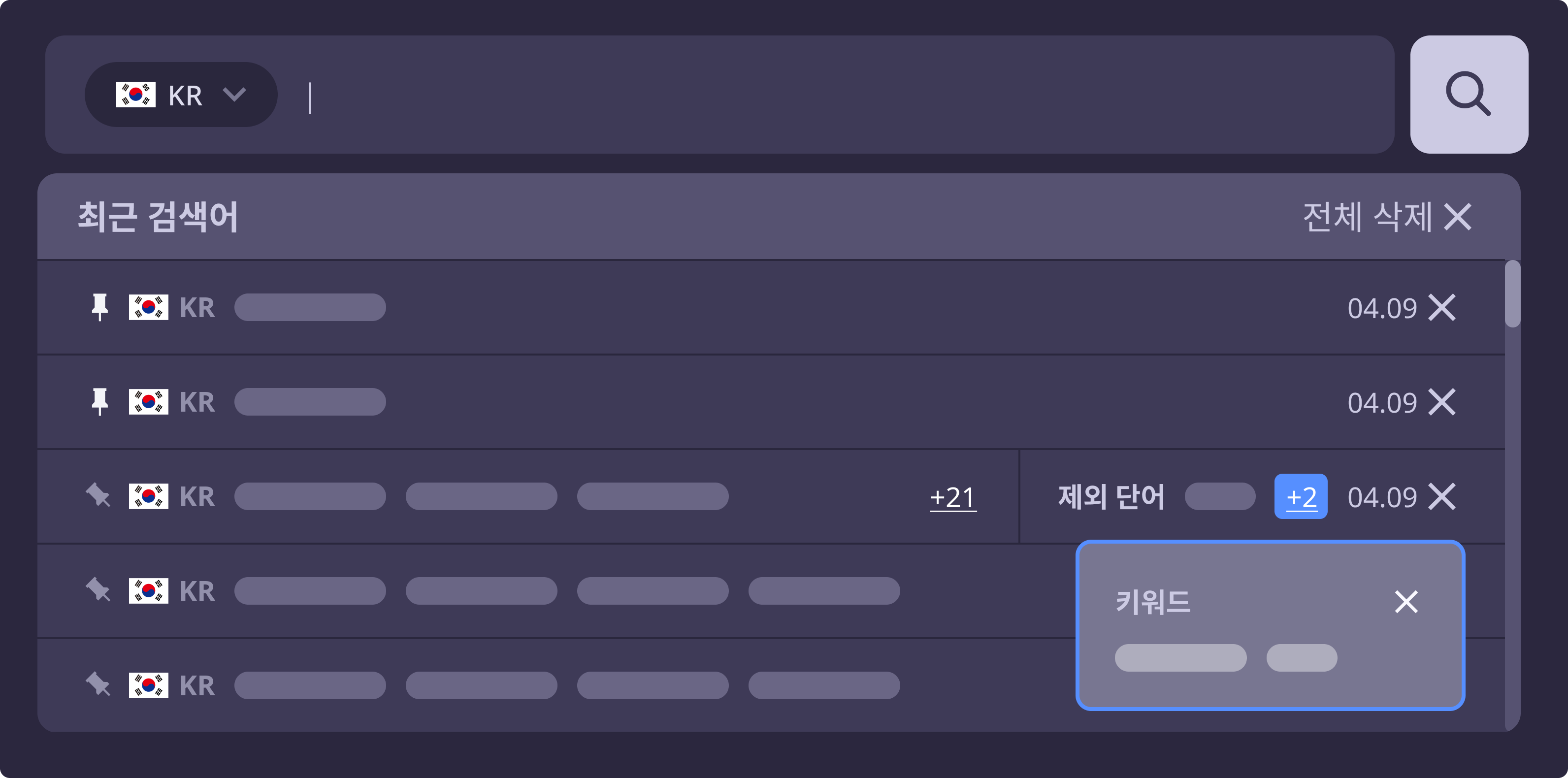 원하는 키워드를 좌측의 핀 아이콘을 통해 최상단에 고정할 수 있으며,