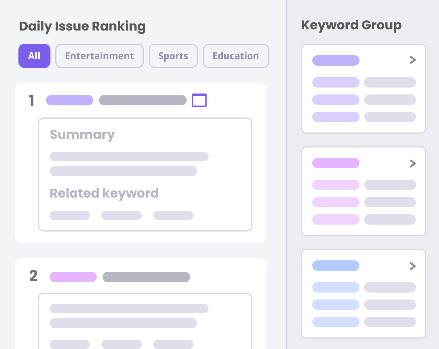 키워드 그룹 : 이슈 키워드 중 공통 단어로 그룹화하여 상위 100개 까지 제공합니다. ( ‘>’ 아이콘을 통해 상세 페이지에서 해당 그룹의 일간 추이를 확인할 수 있습니다.)